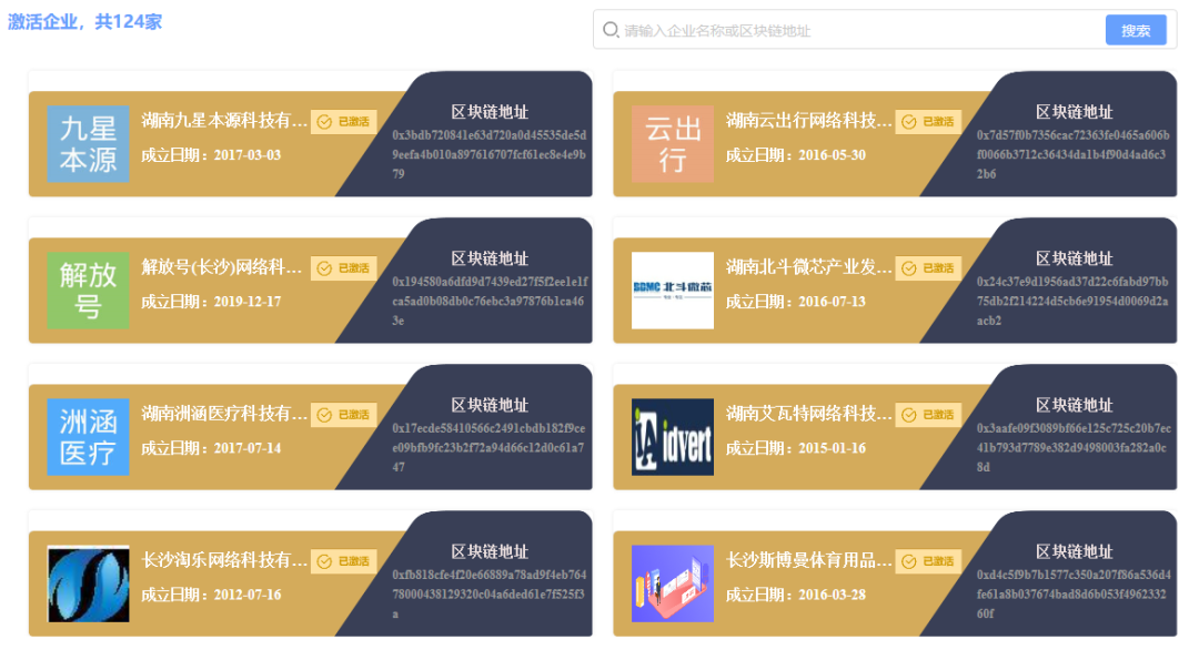 点击具体数据可以看到每一家具体的企业名单,以及对应的区块链地址。