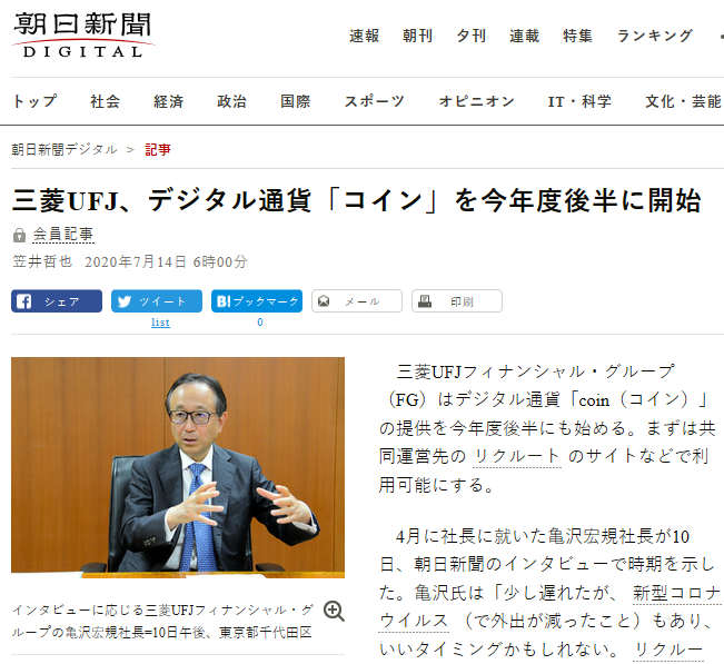 据朝日新闻7月14日报道,世界第五大银行、日本最大的金融公司三菱日联金融集团(MUFG)计划在2020年下半年发行自己的数字货币MUFG Coin。