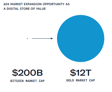 “黄金的市值目前超过12万亿美元,比特币的市值目前约为2000亿美元,不到黄金市场的2%。如果比特币作为价值资产的替代性数字存储增长到黄金的水平,那么这将提供超过60倍的市场扩展机会。”