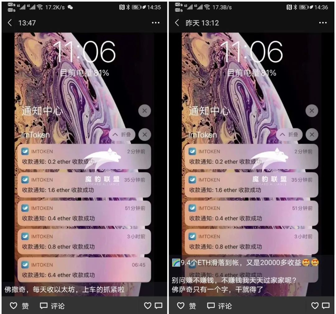 不过进一步分析可见,这些「赚大钱」的截图都存在不少猫腻。据链捕手记者发现,许多截图实际上都没有日期显示,有不同的推广者在不同的日期利用内容完全一样的截图在朋友圈喊单宣传,制造每天都有用户收到大量ETH「滑落」的假象。