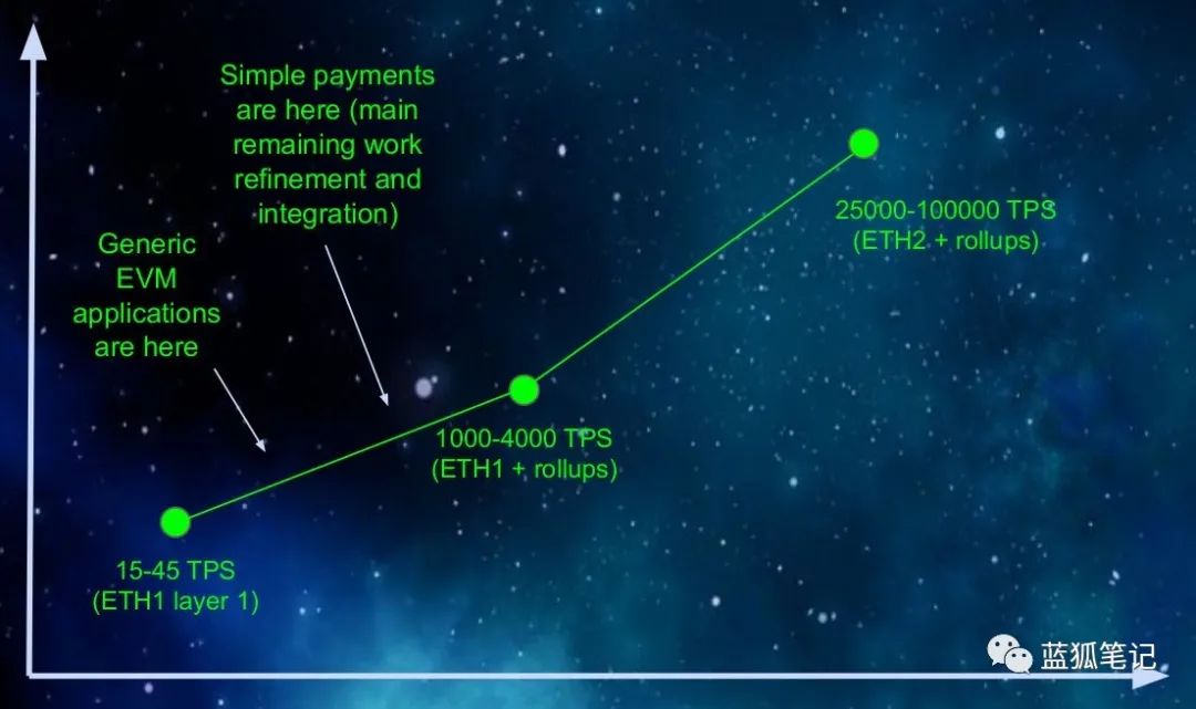 目前比特币的TPS大约为7,而以太坊大约为15,这导致其交易体验非常不好,速度慢,费用高,这在之前的挖矿高峰期尤其明显。为此,以太坊逐渐走向Layer 2的探索,尤其是Rollup系列的实践,此外以太坊的分片也在路上,尽管这需要很长时间。下图是V神对以太坊扩展性的路线展望,从15 TPS走向100,000 TPS的征途。