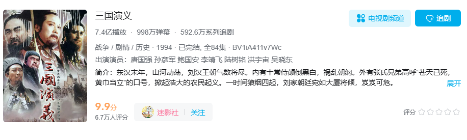 截至今日,94版《三国演义》电视剧在B站累计收获7.4亿播放量,逼近千万条弹幕。