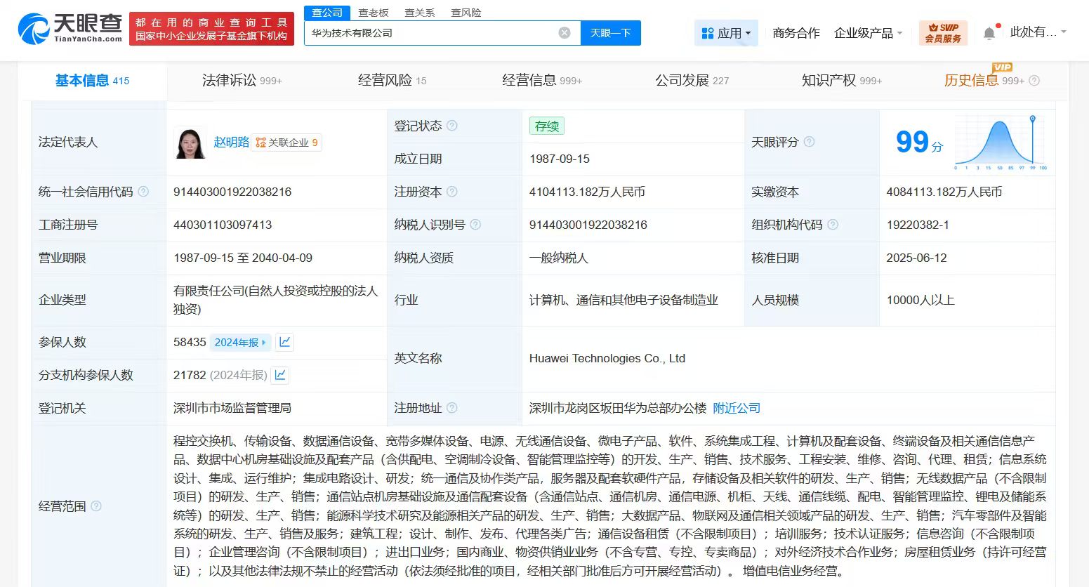 华为技术有限公司成立于1987年9月,法定代表人为赵明路,注册资本约410.4亿人民币,由华为投资控股有限公司全资持股。