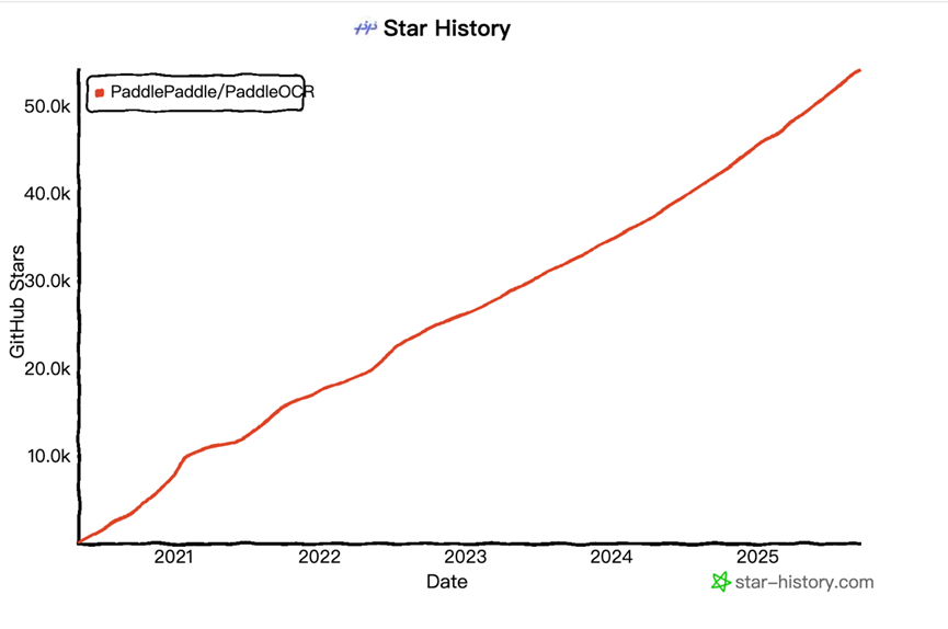 如果把时间线向回追溯,其实不难看到PP-OCRv5这次破圈背后行进轨迹,即其背后是刚刚登上GitHub全球总榜的社区明星选手PaddleOCR,这个低调的国产OCR模型GitHub Star数从2020年开源以来一直呈现稳定、线性的增长。