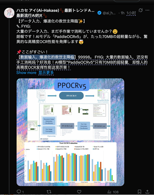 过去的一段时间里,和霸榜成绩接连出现的是一系列针对PP-OCRv5的海内外“自来水”评价,比如Gizchina.com锐评“百度的PP-OCRv5表明,小型号仍然可以发光”,比如再比如来自一系列网友的称赞,如“データ入力、爆速化の救世主降臨✨”(“数据录入,极限提速的救世主降临✨”)、“圧倒的性能でAIモデル「PaddleOCRv5」が、たった70MBの超軽量ながら、驚異的な高精度OCR技術を実装します” (AI模型「PaddleOCRv5」以压倒性的性能,在仅70MB的超轻量体积下,实现了惊人的高精度OCR技术)等等屡见不鲜。
