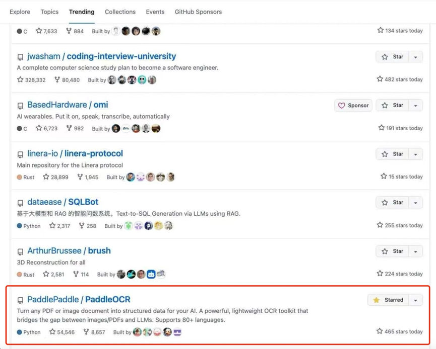 此外,在9月18日,在PP-OCRv5的热度加持下,PaddleOCR项目也更登上了GitHub全球总榜trending榜。