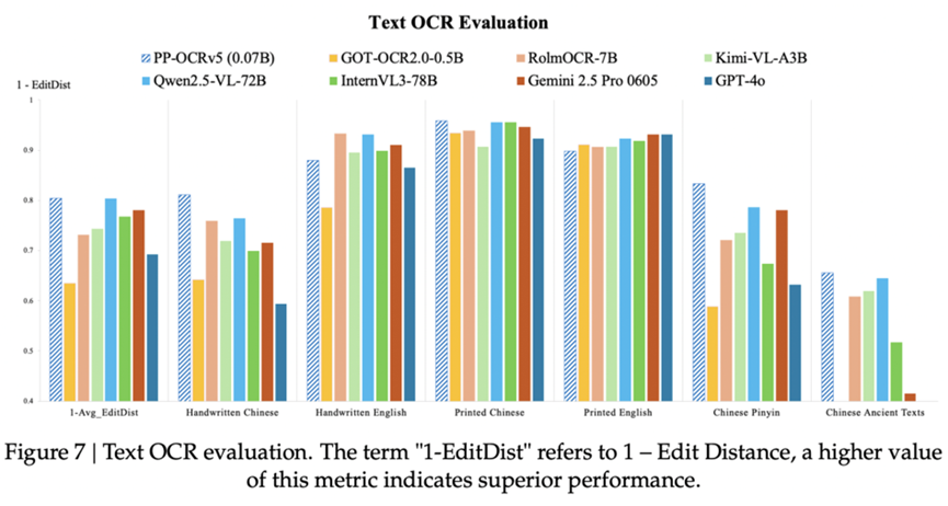 首先,PP-OCRv5兼备模型的轻量级和顶尖性能,从参数量来看,其仅有0.07B参数,约等于Qwen2.5-VL-72B的千分之一,同时相较于开源社群的MiniCPM-o、OCRFlux-3B等参数量级更小一个维度。