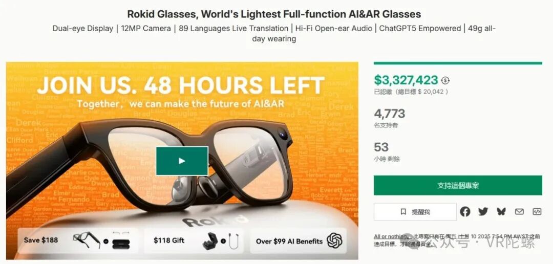 今年8月底,Rokid为旗下产品Rokid Glasses在Kickstarter平台启动众筹。截至北京时间10月8日,该项目已筹集到超过330万美元,共有超过4700名支持者参与。Rokid Glasses迅速成为该平台最成功的可穿戴产品之一,彰显了下一代人工智能眼镜在全球市场的强劲发展势头。