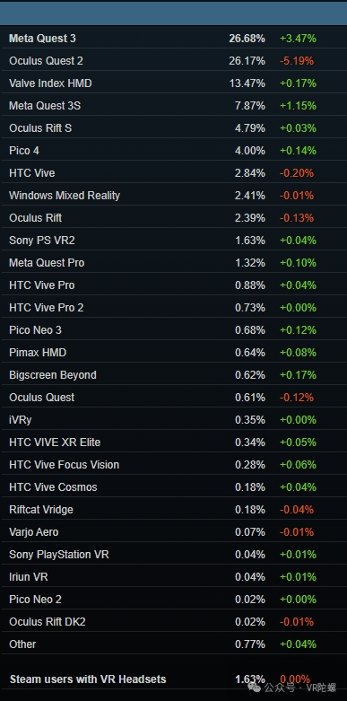近日,Valve公布了2025年9月份SteamVR的硬件设备占比情况,具体如图所示: