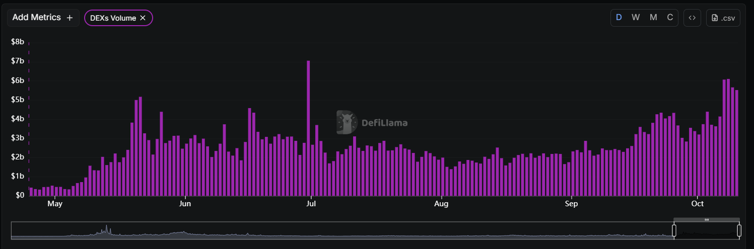 根据 DeFiLlama 统计,过去一周 BNB Chain 交易量达到 143 亿美元,甚至超越了以太坊和 Solana,位居行业第一。
