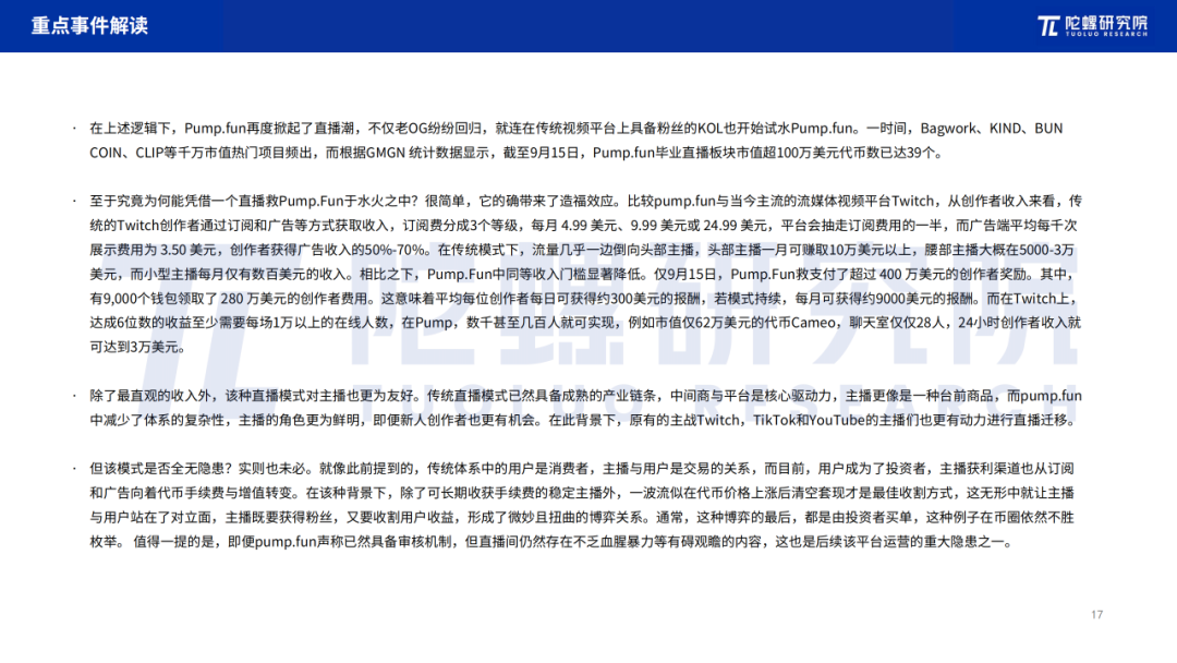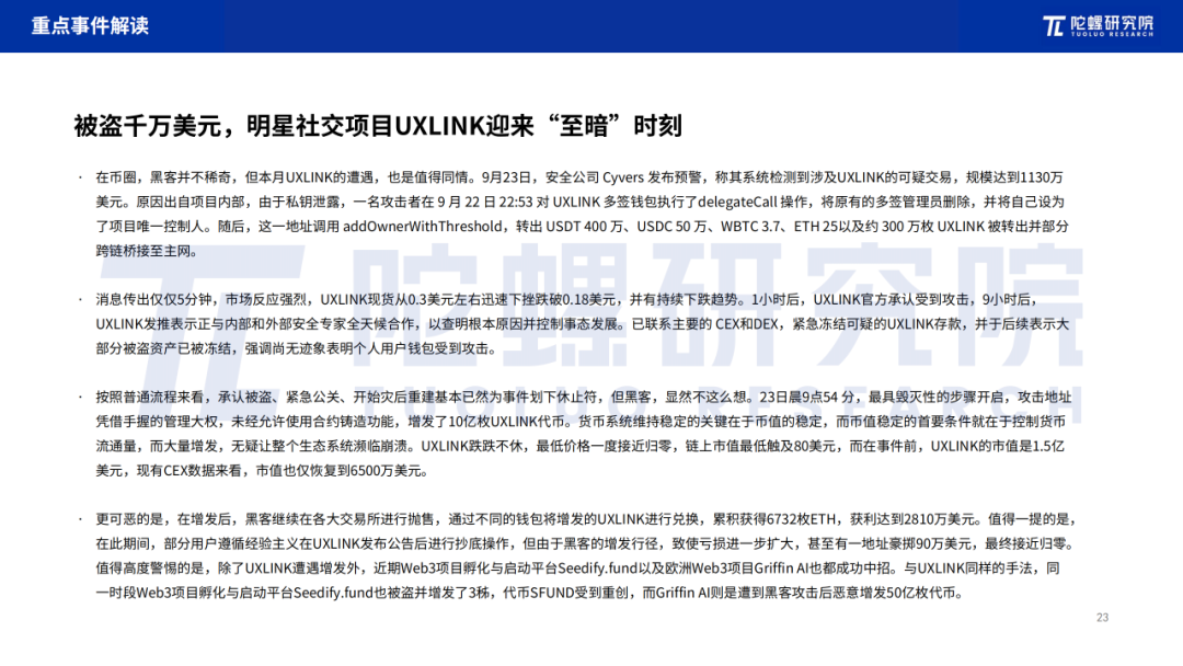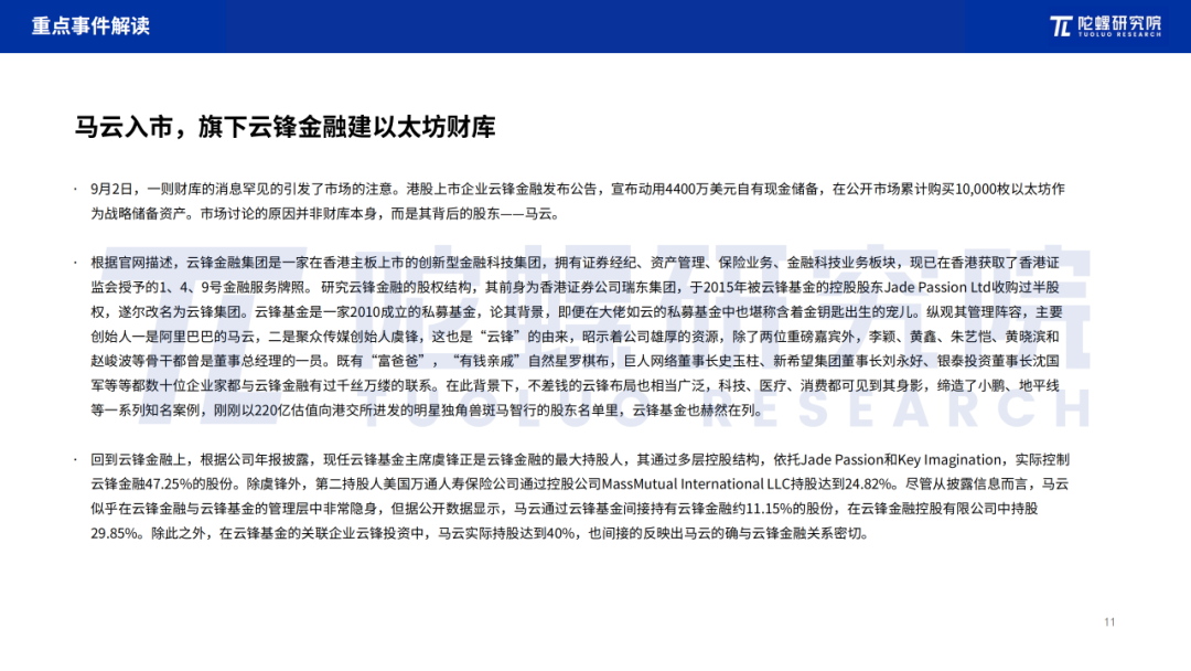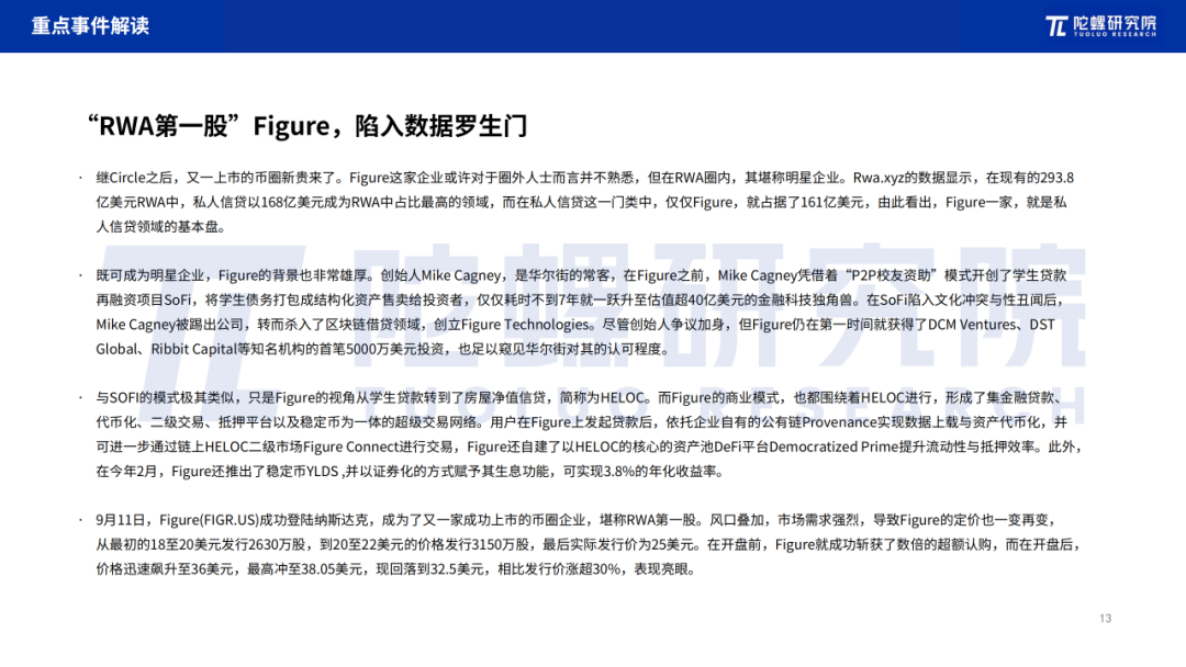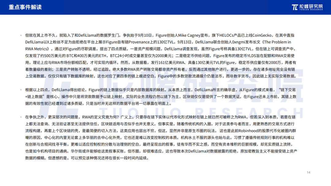 数字人民币方面,中国人民银行数字货币研究所所长穆长春9月在演讲中建议,在宏观层面,目前数字人民币作为中央银行直接负债,实行100%准备金。客户将资金存入钱包后,资金即回笼至央行。基于现责权利一致,穆长春强调,为保障货币供应量与经济增长加上价格预期相适应,同时提升商业银行和用户的积极性,应该对数字人民币的计量框架进行升级,同时通过币串和全局统一账本等业务技术特性,为实体经济发展提供更好的货币服务。整体来看,数字人民币从2014年发展至今,已经历了理论研究、闭环试点到开放试点三大阶段,并逐渐从技术可用性转至使用便捷性,从技术突破延申至实践操作,从规模优化到机制完善,并进一步向着生态构建迈进,但即便如此,数字人民币发展中所面临的挑战不容小觑,尤其是当下,群众使用率、机制有效性都成为了其发展过程中的重要议题。在此背景下,正如穆长春所言,更应与时俱进,以主动求变应对挑战,让数字人民币在理论与实践上进行改革升级,真正成为群众所用、群众想用、群众乐用的货币。数字人民币之外,如火如荼稳定币、RWA被按下了暂停键,据财新报道,互联网平台、中资券商、中资银行等在港机构均被要求暂缓涉及加密资产的各类业务。