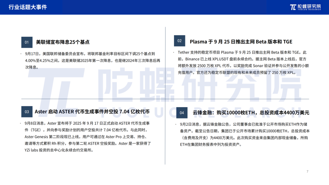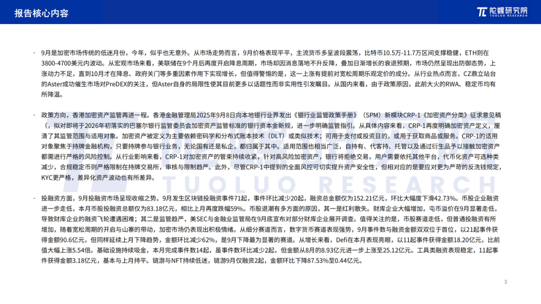 9月是加密市场传统的低迷月份,今年,似乎也无意外。从市场走势而言,9月价格表现平平,主流货币多呈波段震荡,比特币10.5万-11.7万区间支撑稳健,ETH则在3800-4700美元内波动。从宏观市场来看,美联储在9个月后再度开启降息周期,市场却因消息落地不升反降,叠加日渐增长的衰退预期,市场仍然呈现出防御态势,上涨动力不足,直到10月才在降息、政府关门等多重因素作用下实现增长,但值得警惕的是,这一上涨有提前对宽松周期乐观定价的成分。从行业热点而言,CZ鼎立站台的Aster成功催生市场对PreDEX的关注,但Aster自身的局限性使其目前更多以话题性而非实用性引发瞩目。从国内来看,由于政策原因,此前大火的RWA、稳定币均有所降温。