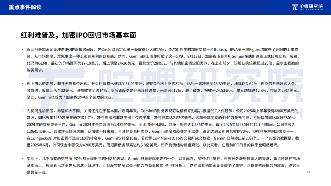 政策方向,香港加密资产监管再进一程。香港金融管理局2025年9月8日向本地银行业界发出《银行业监管政策手册》(SPM)新模块CRP-1《加密资产分类》征求意见稿(,拟对即将于2026年初落实的巴塞尔银行监管委员会加密资产监管标准的银行资本金新规,进一步明确监管指引。从具体内容来看,CRP-1再度明确加密资产定义,厘清了其监管范围与适用对象。加密资产被定义为主要依赖密码学和分布式账本技术(DLT)或类似技术;可用于支付或投资目的,或用于获取商品或服务。CRP-1的适用对象聚焦于持牌金融机构,只要持牌参与银行业务,无论国有还是私企,都归属于其中。适用范围也相当广泛,自持有、代客持、托管以及通过衍生品予以接触加密资产都需进行严格的风险控制。从行业影响来看,援引律师观点,CRP-1对加密资产的管束持续收紧,针对高风险加密资产,银行将拒绝交易,用户需要依托其他平台,代币化资产可选种类减少,合规稳定币则严格限制在持牌交易所,审核与限制趋严。此外,尽管CRP-1中提到的全面风控可切实提升资产安全性,但相对应的是要应对更为严苛的反洗钱规定,KYC更严格,差异化资产波动也有所差异。