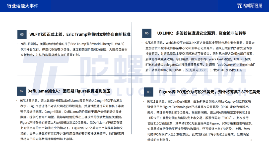 投融资方面,9月投融资市场呈现收缩之势。9月发生区块链投融资事件71起,事件环比减少20起,融资总金额仅为152.21亿元,环比大幅度下滑42.73%。币股企业融资进一步走低,本月币股投融资总额仅为83.18亿元,相比上月再度跌幅59%。币股退潮有多方面的原因,其一是红利散失。财库企业大幅增加,屯币溢价在9月显著走低,导致财库企业的融资飞轮遭遇困难;其二是监管趋严,美SEC与金融业监管局在9月底宣布对部分财库企业展开调查。值得关注的是,币股赛道走低,但普通投融资有所增加,随着宽松周期的开启与山寨的带动,加密市场仍表现出积极情绪。从细分赛道而言,数字货币赛道表现强势,9月事件数与融资金额双双位于首位,以21起事件获得金额90.6亿元,但同样延续上月下降趋势,金额环比减少62%,是9月下降最为显著的赛道。从增长来看,Defi在本月表现亮眼,以11起事件获得金额18.20亿元,比前值大幅上涨5.54倍。基础设施持续吸金,本月完成事件数14起,虽事件数环比减少2起,但金额从8月的8.93亿元进一步上涨至25.12亿元。工具类融资表现稳定,11起事件获得金额3.18亿元,基本与上月持平。链游与NFT持续低迷,链游9月仅融资2起,金额环比下降87.53%至0.44亿元。