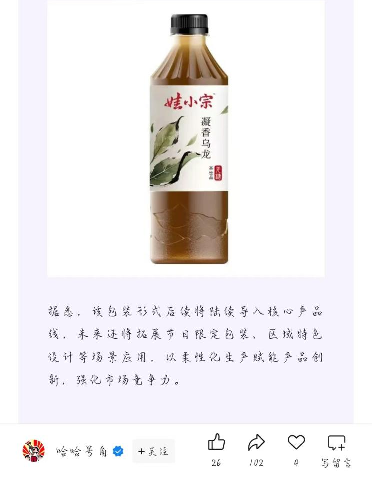 5月12日,娃哈哈集团官方公众号“娃哈哈家园”(现更名“哈哈号角”)发文中,亦曾曝光了一款以“娃小宗”为名的无糖茶饮料,口味为“凝香乌龙”。