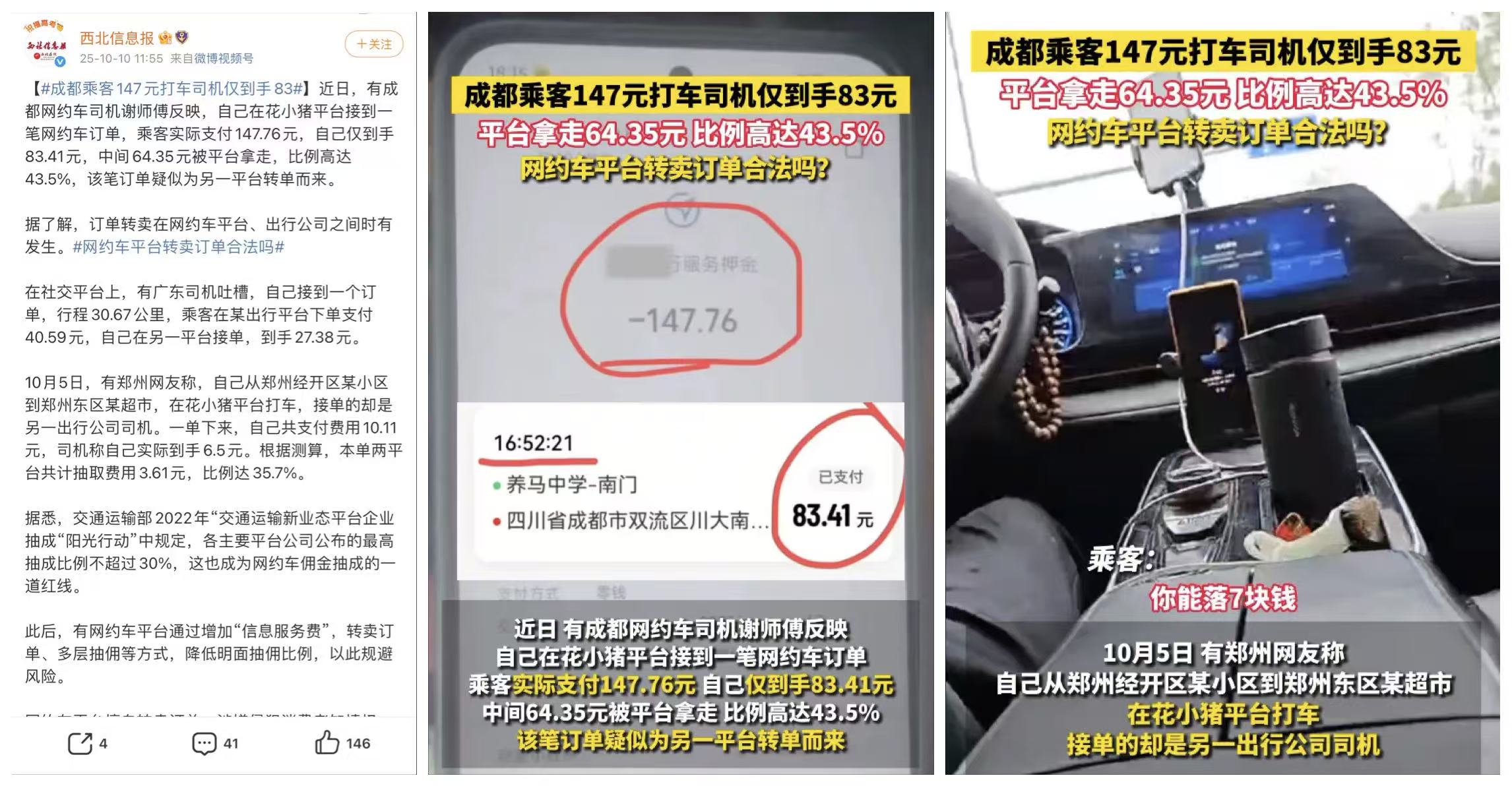 从行业现状看,破局的关键在于强化监管穿透力。目前,西安、开封、鹰潭等多地已叫停“一口价”订单,聚合平台被要求将抽成上限控制在27%,但更需建立长效机制。唯有如此,才能终结司乘双输的博弈困局,推动网约车行业回归服务本质。(图源:微博、黑猫等平台)