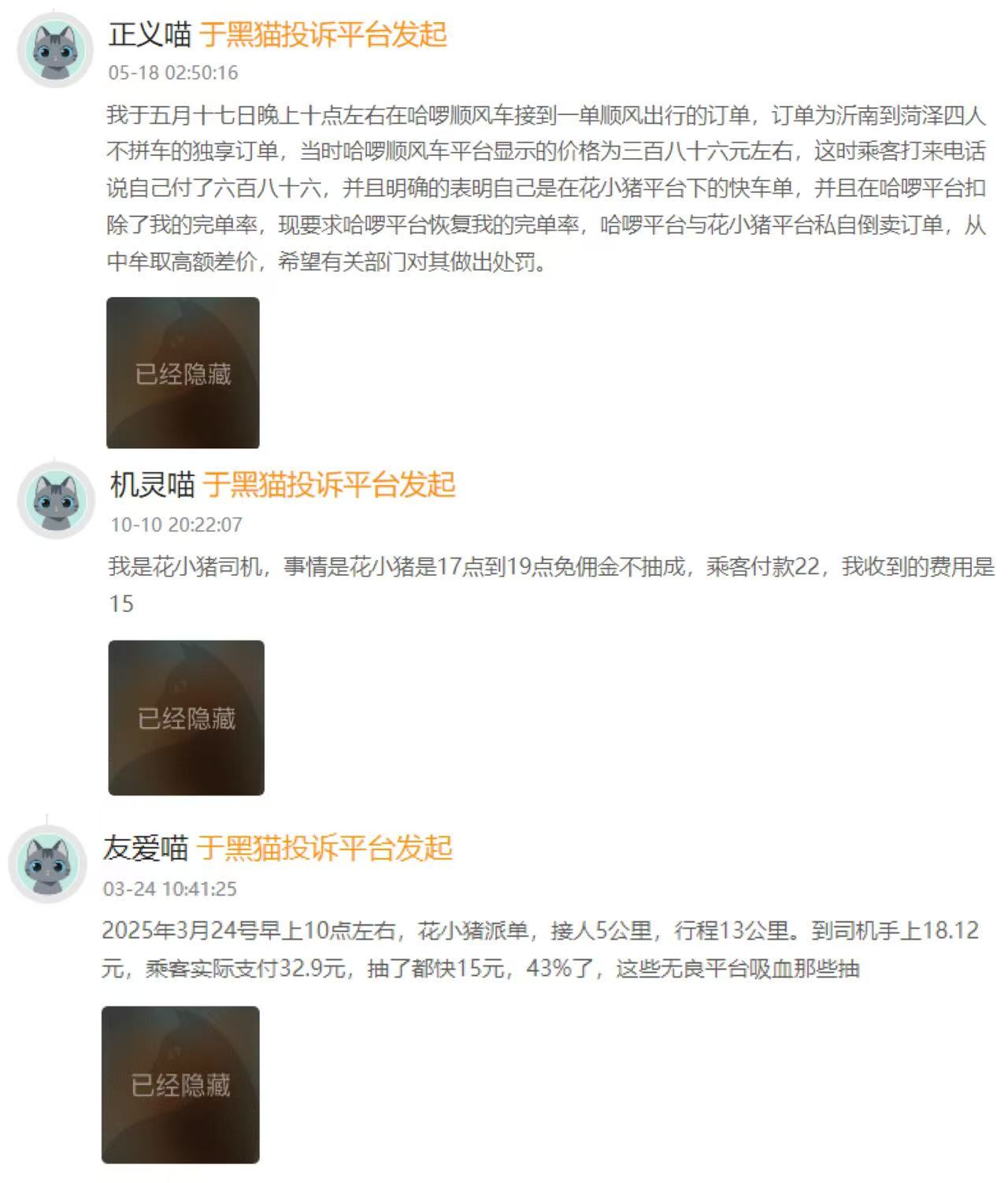 司机群体面临的生存压力,最终可能传导并转化为乘客服务体验的下降。在黑猫投诉平台关于花小猪的投诉中,“司机临时加价”“服务态度差”“接单后被取消”等关键词反复出现,暴露出司机群体在高压下的服务变形。