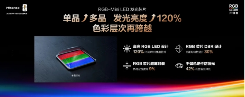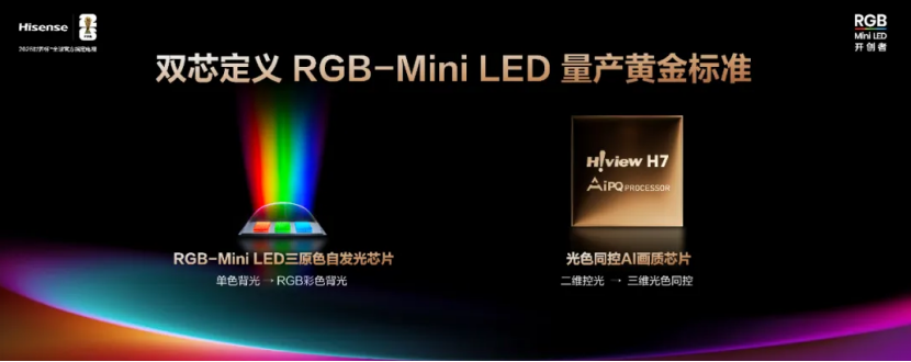 海信通过自研的RGB三原色Mini LED芯片(半波宽窄至行业极限)与H7 AI画质芯片,攻克了红光材料效率低、高温色偏等行业难题,成为全球唯一量产真RGB-Mini LED的品牌。