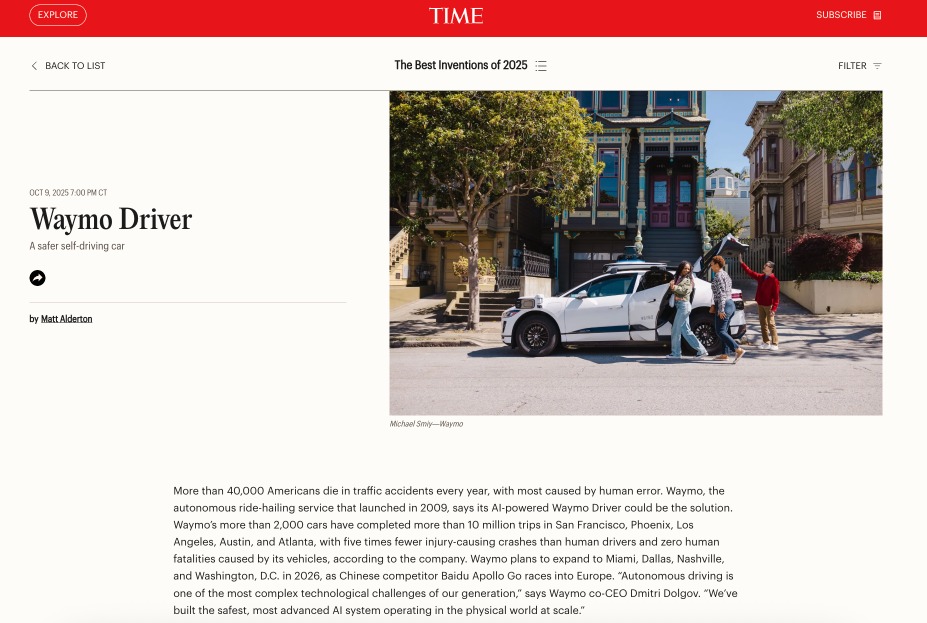 当地时间10月9日,全球权威新闻周刊《时代》将无人驾驶技术列入2025年最佳发明榜单。值得注意的是,《时代》还特意将中国的“萝卜快跑”标注为Waymo在全球“最大的竞争对手”。