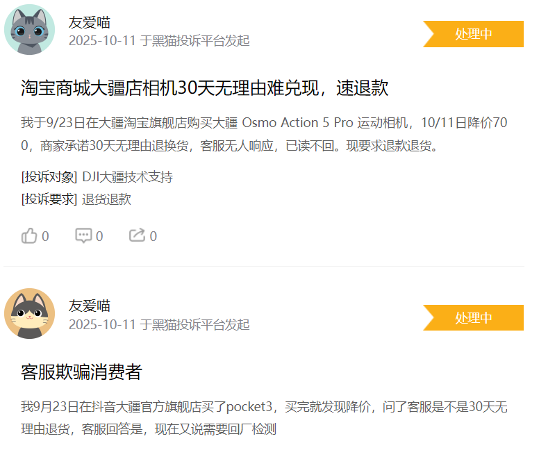 事实上,与李露露有类似遭遇的消费者不在少数。在一些社交平台和消费者维权平台上,大量消费者反馈,自己近期在大疆线下授权店或部分合作线下门店购买产品后,遭遇降价且无法获得差价补偿的情况,而线下门店给出的理由多为“非质量问题不支持退换货”“没有退差价政策”等。