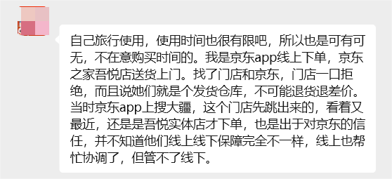 “门店一口拒绝,而且说她们就是个发货仓库,不可能退货退差价。”李露露表示,之后她又尝试通过京东线上平台协调,可得到的回复是线上管不了线下店。