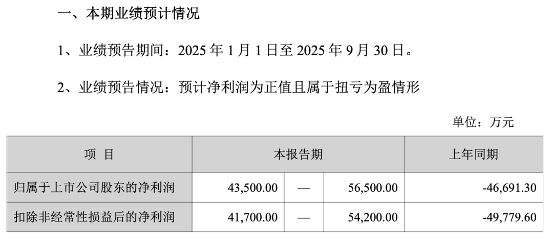 报告显示,公司前三季度预计实现净利润为4.35亿元至5.65亿元;扣非净利润预计4.17亿元至5.42亿元。较去年同期大幅扭亏为盈。