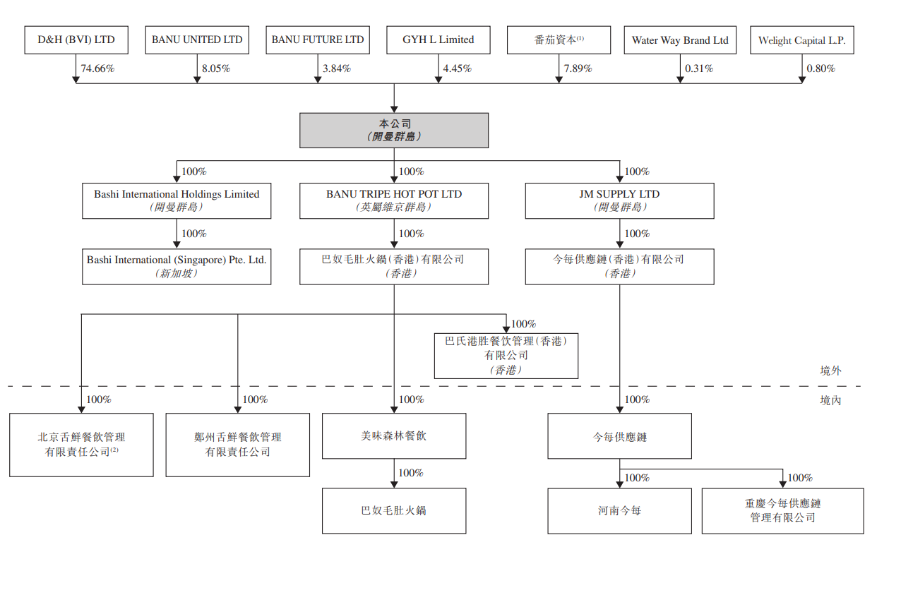 从股权结构看,巴奴火锅采用“境外架构”:实控人杜中兵与配偶韩艳丽通过D&H(BVI)LTD控制已发行股本的75.26%,通过BANU UNITED LTD持有已发行股本的8.11%,合计控制约83.38%的投票权。