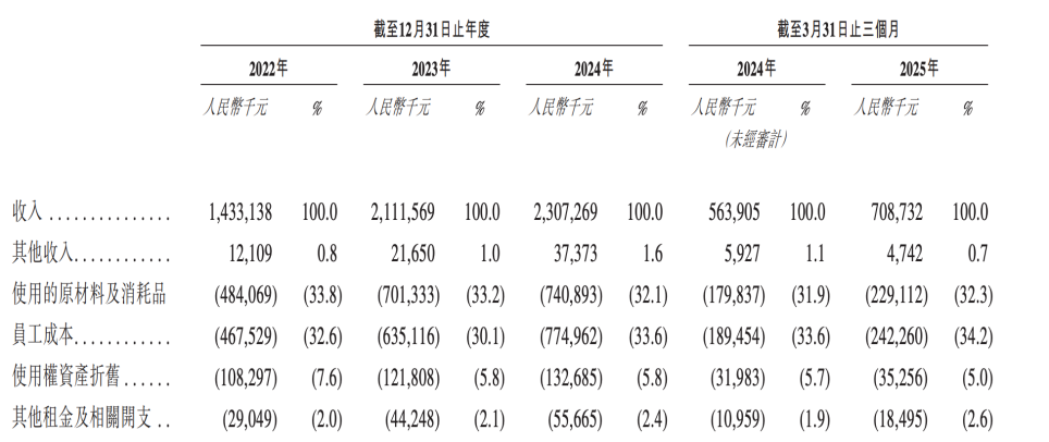 2022年至2025年一季度,巴奴火锅的营收分别为14.33亿元、21.12亿元、23.07亿元和7.09亿元;净利润分别为-519万元、1.02亿元、1.23亿元和5516万元,三年三个月合计赚了2.8亿元。