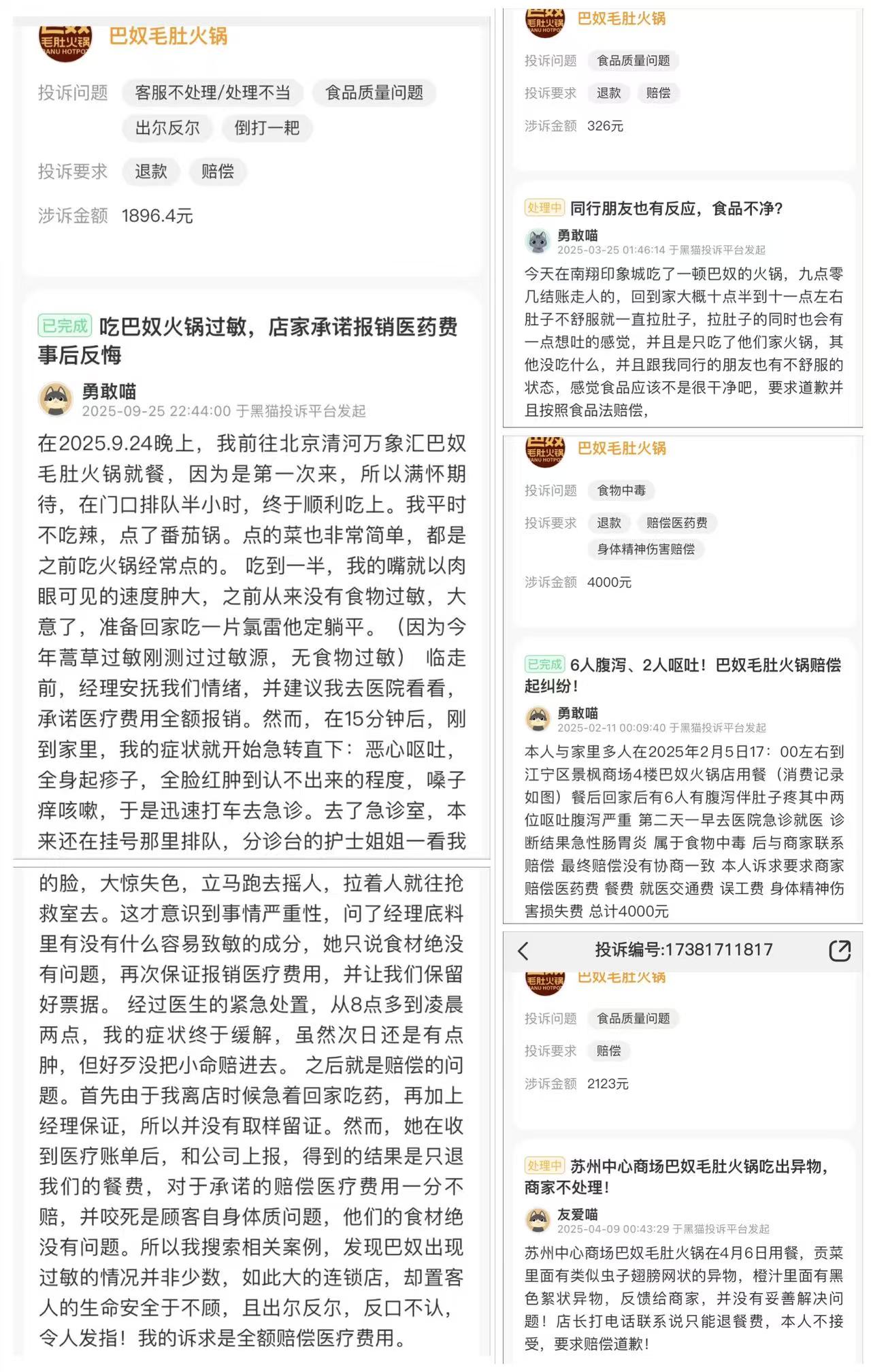 值得关注的是,巴奴火锅在快速扩张过程中还面临品质控制难题。截至10月16日,在黑猫投诉平台上关于巴奴火锅的投诉为48条,涉及食物中毒、异物等严重食品安全问题。对于仅有145家门店的巴奴火锅而言,意味着每3家门店就有1起投诉。