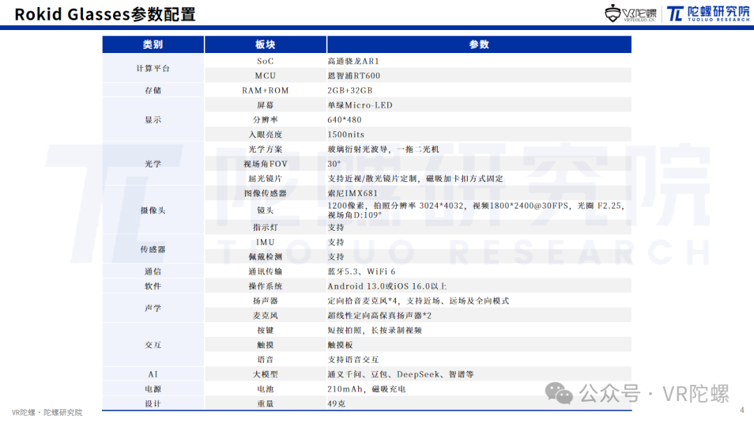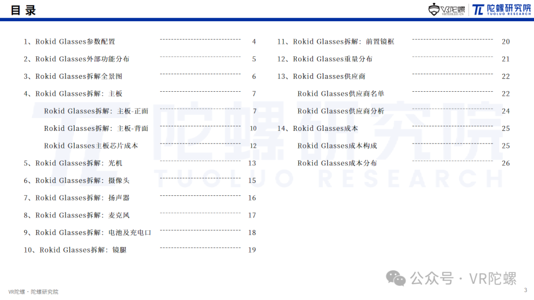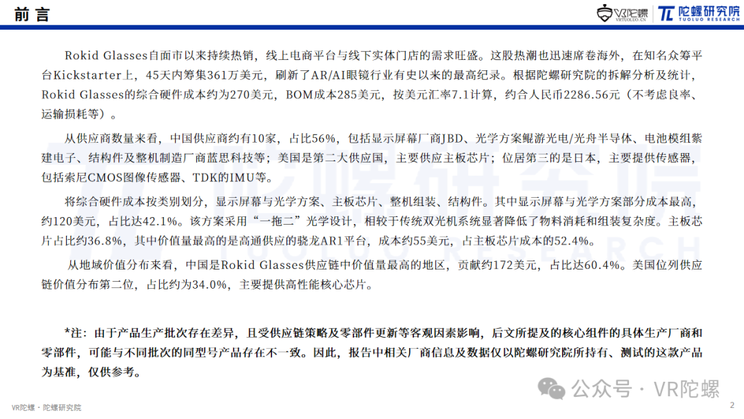 Rokid Glasses自面市以来持续热销,线上电商平台与线下实体门店的需求旺盛。这股热潮也迅速席卷海外,在知名众筹平台Kickstarter上,45天内筹集361万美元,刷新了AR/AI眼镜行业有史以来的最高纪录。根据陀螺研究院的拆解分析及统计,Rokid Glasses的综合硬件成本约为270美元,BOM成本285美元,按美元汇率7.1计算,约合人民币2286.56元(不考虑良率、运输损耗等)。