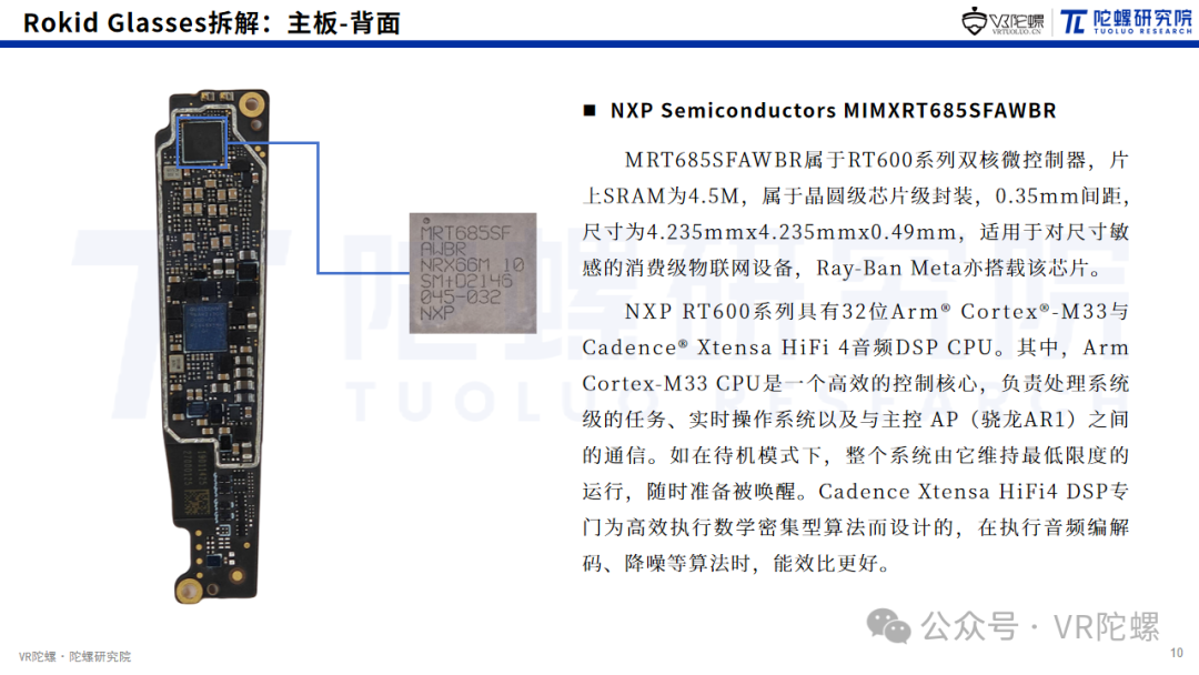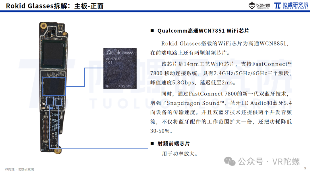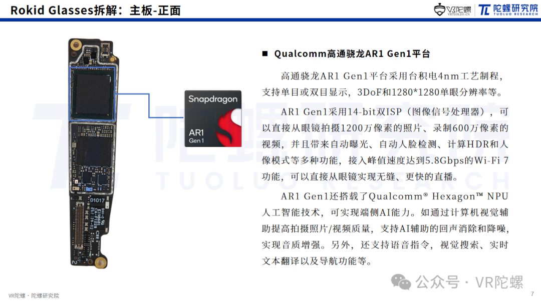 将综合硬件成本按类别划分,显示屏幕与光学方案、主板芯片、整机组装、结构件。其中显示屏幕与光学方案部分成本最高,约120美元,占比达42.1%。该方案采用“一拖二”光学设计,相较于传统双光机系统显著降低了物料消耗和组装复杂度。主板芯片占比约36.8%,其中价值量最高的是高通供应的骁龙AR1平台,成本约55美元,占主板芯片成本的52.4%。