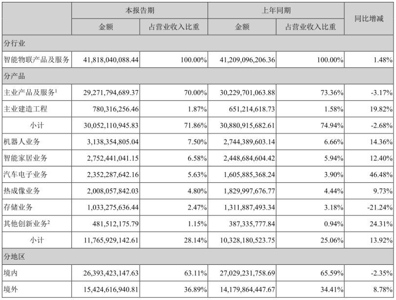 不过,随着销售基数的扩大,从拉长周期来看,海康威视创新业务营收增速仍然出现了明显的放缓迹象。2025年上半年,海康威视创新业务共实现营收117.66亿元,同比增长13.92%,占公司营收比重达到28.14%。其中,海康机器人、萤石网络、海康汽车电子、海康微影等主要业务均已在各自领域取得领先地位,成为公司业务增长的有力保障。