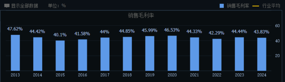 事实上,随着创新业务占比的提升,海康威视近几年综合毛利率处于明显的下滑趋势。数据显示,2020年-2024年,创新业务在海康威视总收入中的占比由9.71%提升至24.31%。同期,公司销售毛利率则由46.53%下滑至43.83%。
