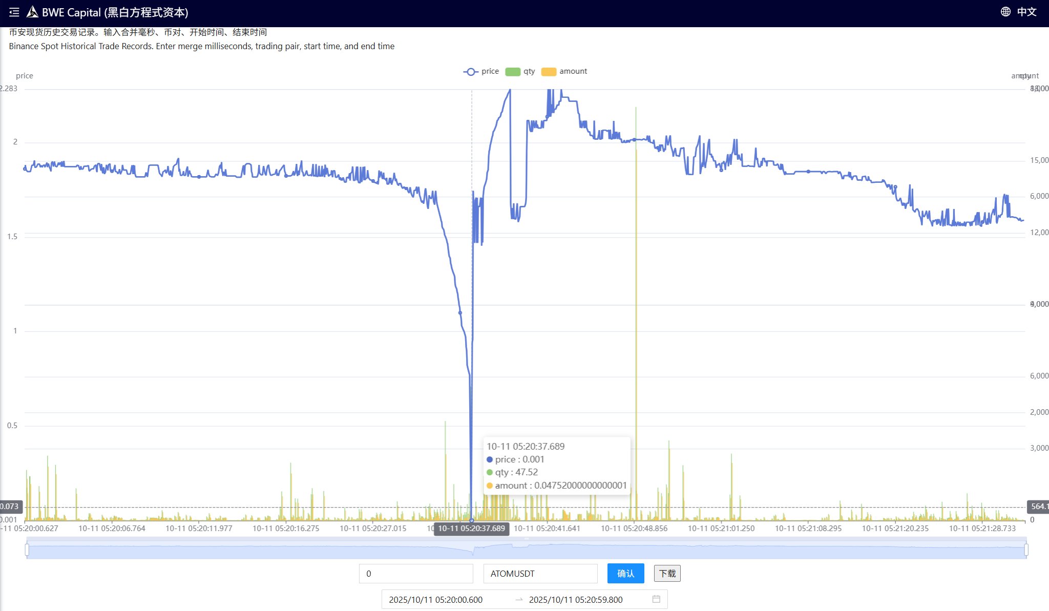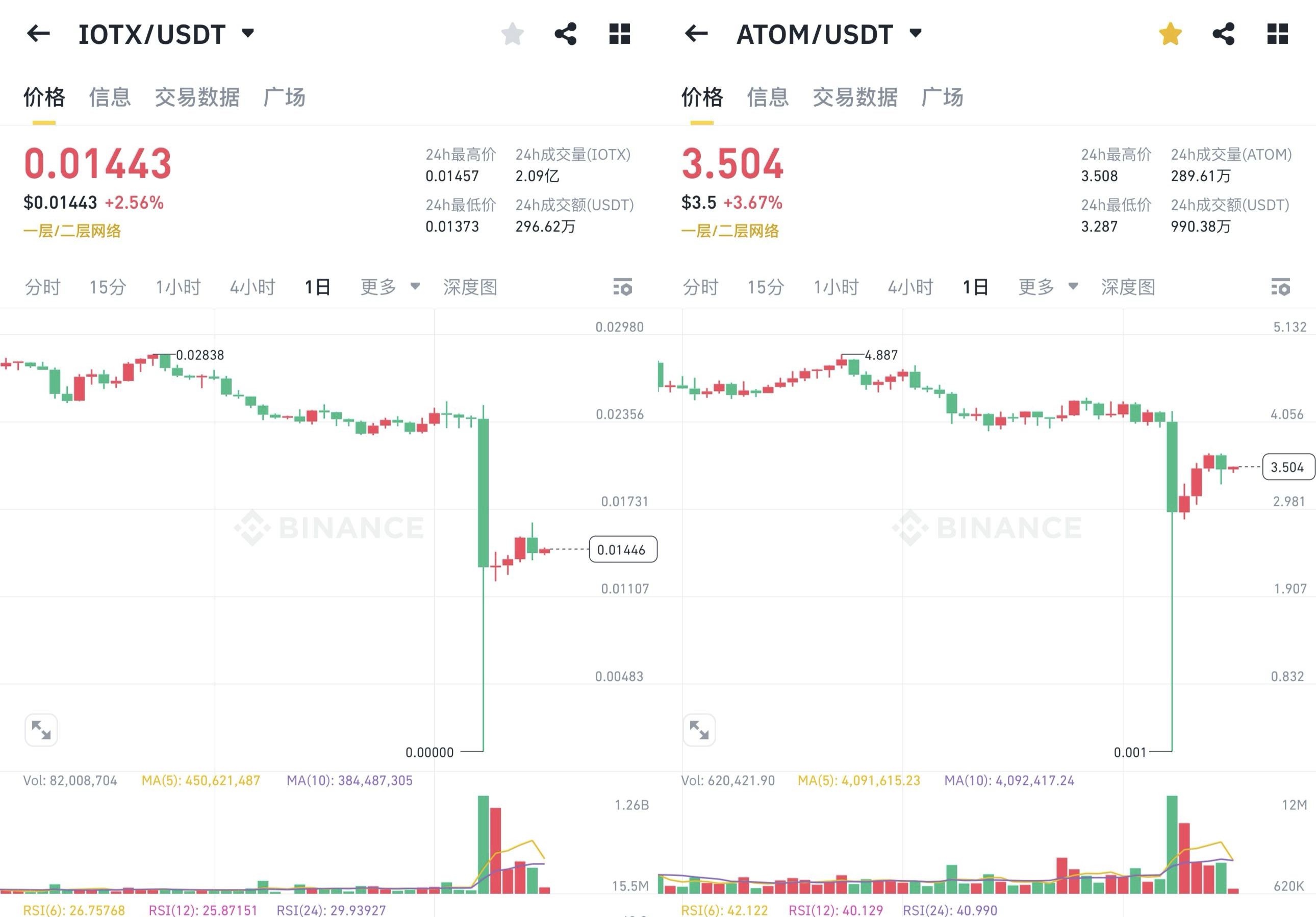 方程式新闻创始人 Vida 在昨日下午发推称,通过其记录的币安实时推送的订单簿和成交记录来看,ATOM/USDT 交易对确实因为成交订单而在 0.001 USDT 的价格停留了 8 毫秒,且成交了 47.52 枚 ATOM。IOTX 则是在极低的价格上成交了 1.1 亿枚,且 Vida 猜测可能是某个使用 IOTX 当作杠杆交易保证金机构的统一账户爆仓导致价格的异常。