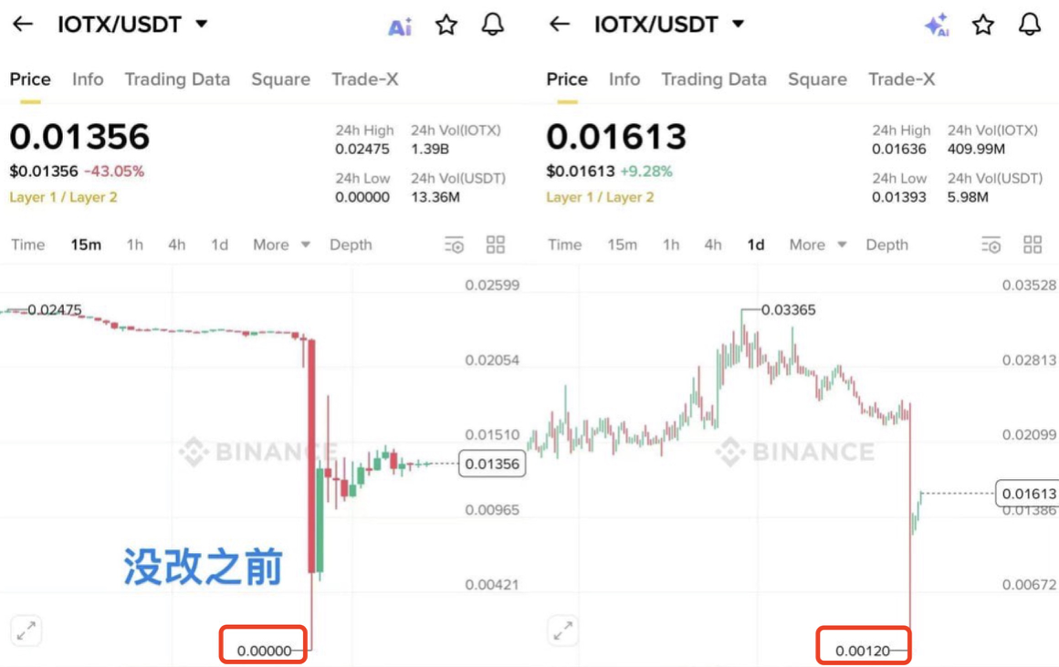币安在公告中表示,造成「价格归零」主要有两点原因,其一就是平台上存在着一部分挂出多年的历史限价单(部分可追溯至 2019 年,如 IOTX、ATOM 等)。在极端行情中,市场大量卖单导致流动性单边,系统会继续撮合市价卖单,历史限价单被触发,导致代币价格在瞬间被拉至极低水平,从而形成「价格插针」现象。其二就是,部分交易对(如 IOTX/USDT)因近期减少最小价格变动的位数,导致成交价的小数位无法正确显示,造成视觉上价格「归零」的错觉。