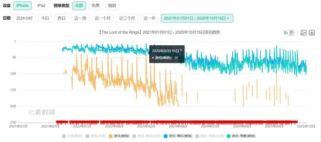 这一机制革新也游戏在初登海外市场时赢得了亮眼成绩。data.ai数据显示,《指环王:纷争》国际服于2021年9月23日上线,成功登陆全球超100个市场,更在44个市场中跻身iOS游戏畅销榜TOP10。但其巅峰状态未能持久,以美国市场为例,游戏最高排名至第33名(2022年6月),随后热度便迅速滑落,约两年后已跌出200名开外。