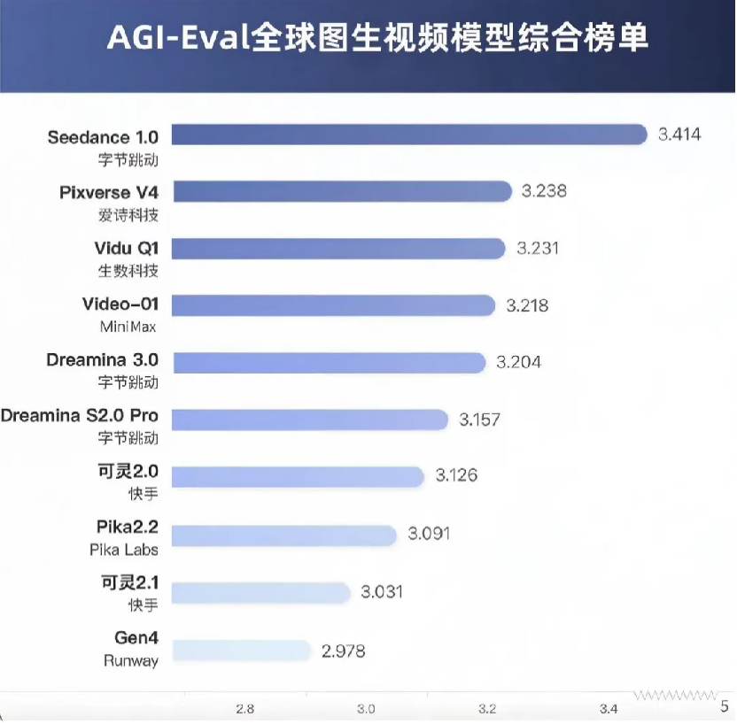 例如在 AGI-Eval 全球图生视频AI模型排名中,火山引擎的 Seedance 1.0 拿下冠军,Gen4 跌至末位。