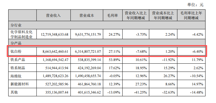 财报显示,2025年上半年,龙佰集团钛白粉营业收入为86.64亿元,同比下降7.68%。此外,该业务毛利率为27.11%,比上一年减少6.40%。