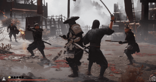 一是此前《对马岛之魂》着力塑造的那种泥泞、混乱的“一打多无锁定战斗”,在《羊蹄山》中被进一步发扬光大了。即虽然玩家的操作不困难,敌人的逻辑也很清晰,但局势却总是很复杂。
