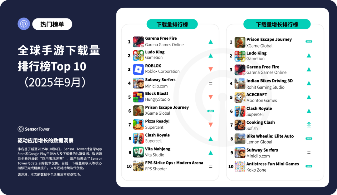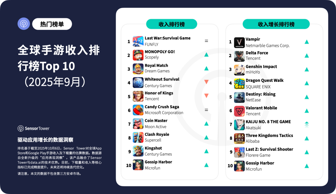 【6】根据Sensor Tower发布的“2025年9月全球手游收入与下载量榜单,9月份的全球手游收入榜头部依然由老面孔占据,《Last War》、《MONOPOLY GO!》和《Royal Match》稳居前三。它们的共同点是都依赖高强度的活动运营来维持收入,无论是赛季更新、主题活动还是各类通行证,都安排得相当紧密。
