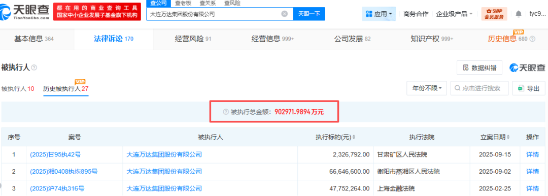 另据天眼查数据,截至10月17日,万达现存49条股权冻结信息、10 条被执行人信息,累计被执行金额约52.63亿元,而历史被执行金额达90.3亿元。