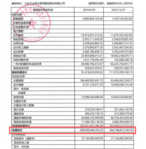 而截至2024年9月底,万达旗下核心业务大连万达商管合计负债高达2990.30亿元,资产负债率达48.7%。