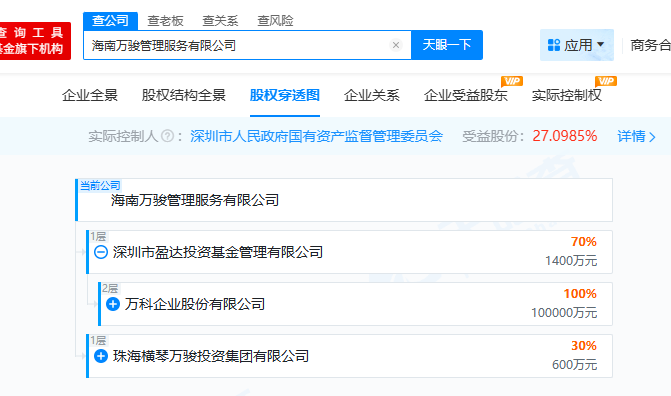 天眼查显示,海南万骏由万科全资子公司深圳市盈达投资基金管理公司控股70%。
