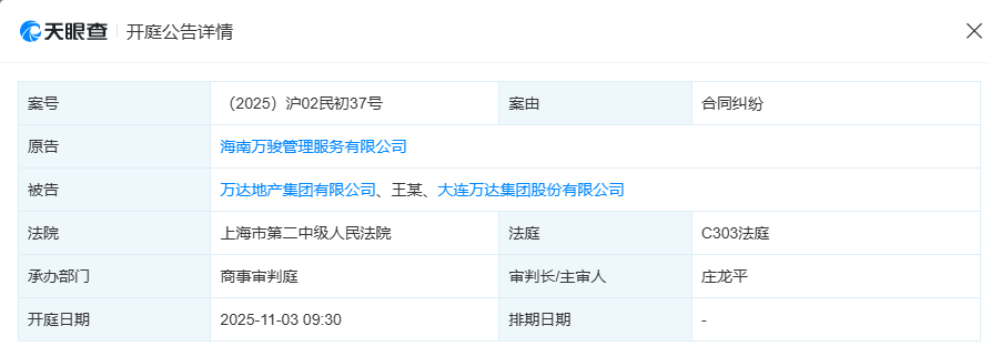 10月16日,天眼查APP显示,原告海南万骏与被告王健林、万达、万达地产相关合同纠纷案即将在11月3日开庭,审理法院为上海市第二中级人民法院。