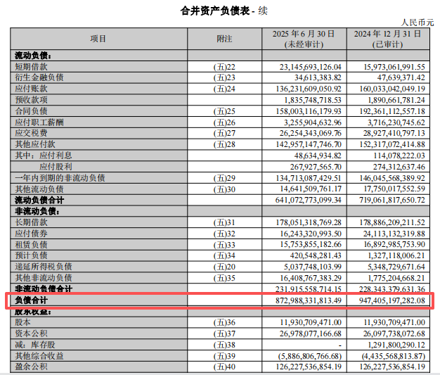 此外,半年度报告还显示,2025年上半年,公司总负债规模已突破8700亿元,资产负债率高达73.1%。其中有息负债达3642.6亿元,占总资产的30.5%。
