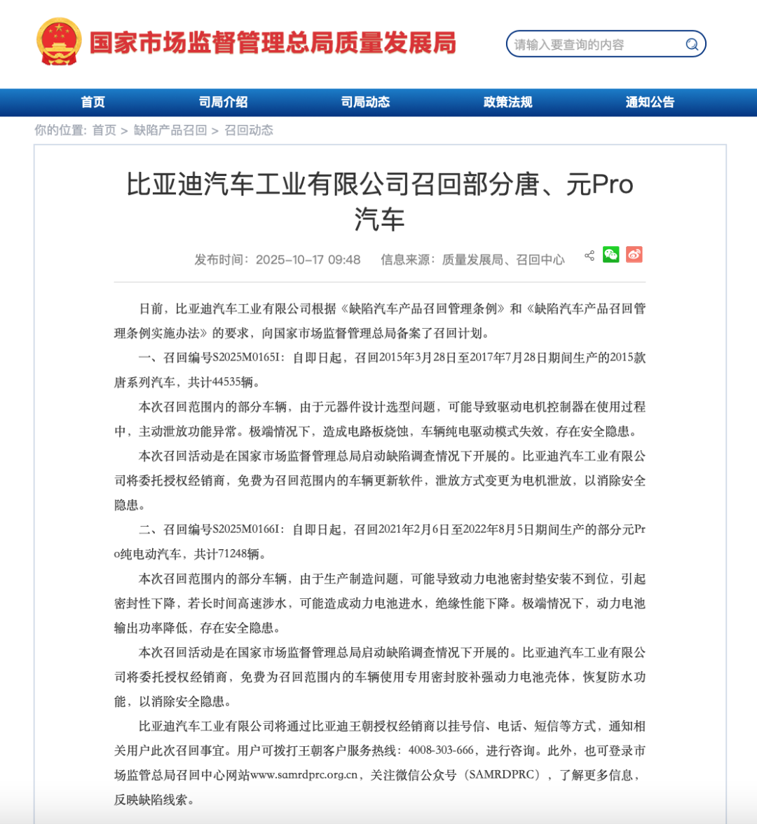 10月17日,国家市场监督管理总局官网发布重磅消息,比亚迪汽车工业有限公司根据《缺陷汽车产品召回管理条例》和《缺陷汽车产品召回管理条例实施办法》的要求,向国家市场监督管理总局备案了两项召回计划,共计召回车辆11.58万辆。