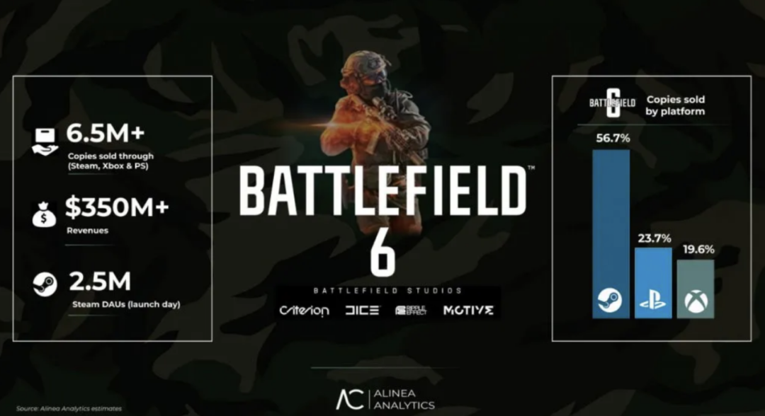 在此之前,市场分析公司Alinea Analytics预估,《战地6》在发售后四天内,PC与主机平台销量将达650万套,营收约3.5亿美元(约合25亿元人民币)。而实际数据显示,其表现更为强劲。