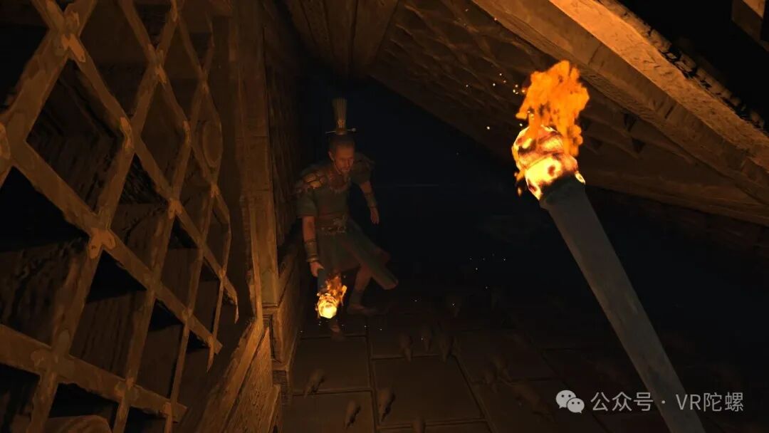 VR陀螺:还有一个技术难点我们也非常好奇,就是你们对于“光”的研究。在体验的过程中有一个细节给了我们很大的惊艳,就是拾起火把照亮“人皮仓”的一幕,当时环境里出现的实时变化的光源表现非常真实,这一点你们是如何做到的?
