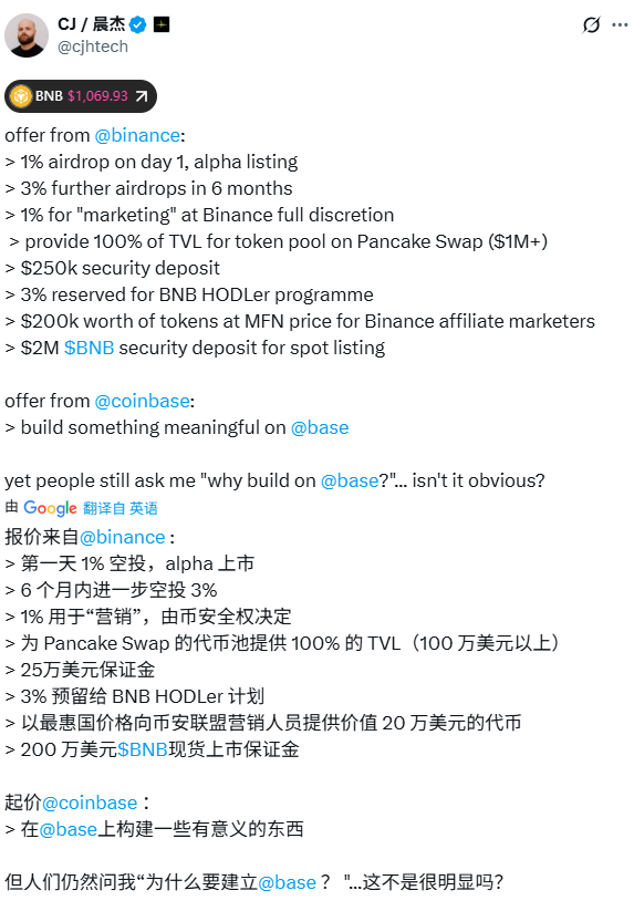 一波未平一波又起,10月14日,关于币安上币费传闻又引发了讨论。Limitless的创始人 CJ公布了一条关于币安上币价的数据,表示币安上币要求1% Alpha空投+3%额外空投+1% 营销+1M+ Pancake TVL +250k保证金+3% BNB Holder奖励+2 M现货保证金。此言一出,西方以Base为首的社区立刻展开了对币安的攻讦,The Block、BORED、1confirmation均进行了曝光或站队支持。