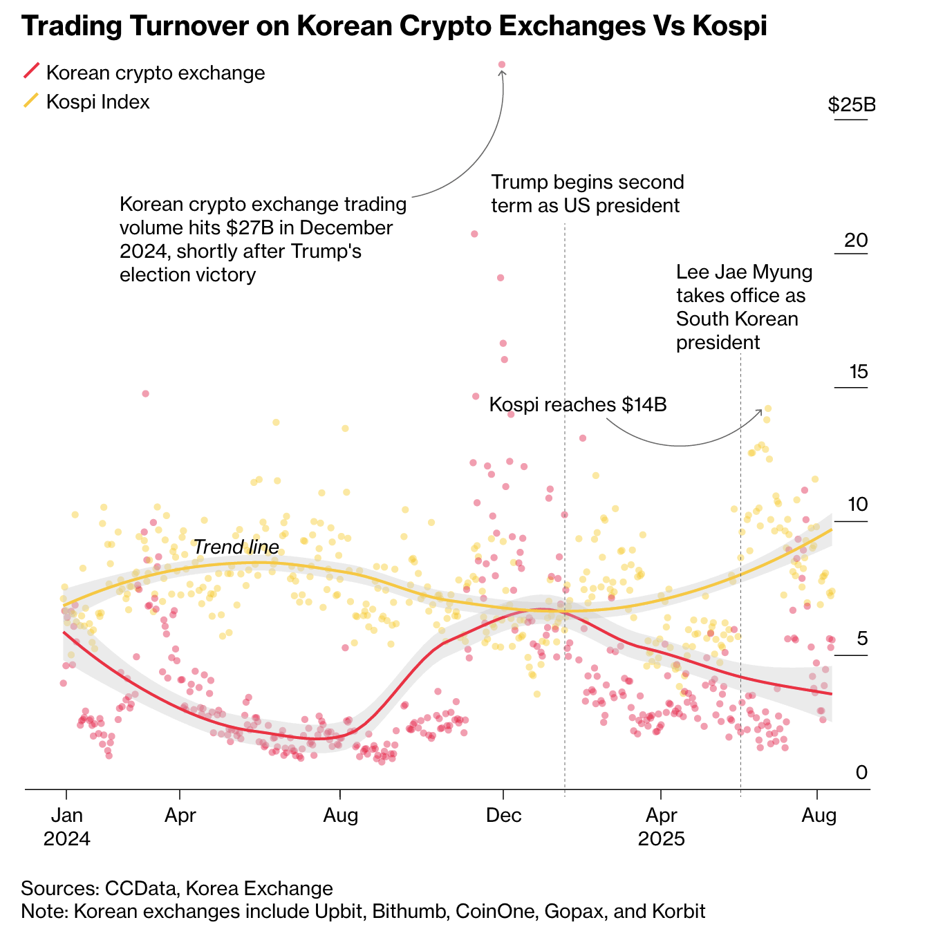 这种全民投资的现象不仅改写了韩国金融生态,也引发监管层的担忧。事实上,散户在韩国股市中影响力巨大,约占每日成交量的三分之二。此前,韩国政府曾因散户强烈反对而叫停新的资本利得税计划。而如今他们正大举涌入加密市场,特别是特朗普当选美国总统以后,当地加密交易所的交易量激增,已达到该国股指基准Kospi成交额的约80%,包括稳定币也吸引了吸引了大量关注。同时,由于韩国国内监管严格,将许多投资者将交易转向海外市场。